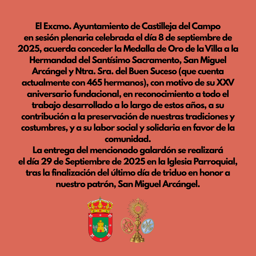 El Excmo. Ayuntamiento de Castilleja del Campo en sesión plenaria celebrada el día 8 de septiembre de 2025, acuerda conceder la Medalla de Oro de la Villa a la Hermandad del Santísimo Sacramento, San Miguel Arcángel y Ntra. Sra. del Buen Suceso .