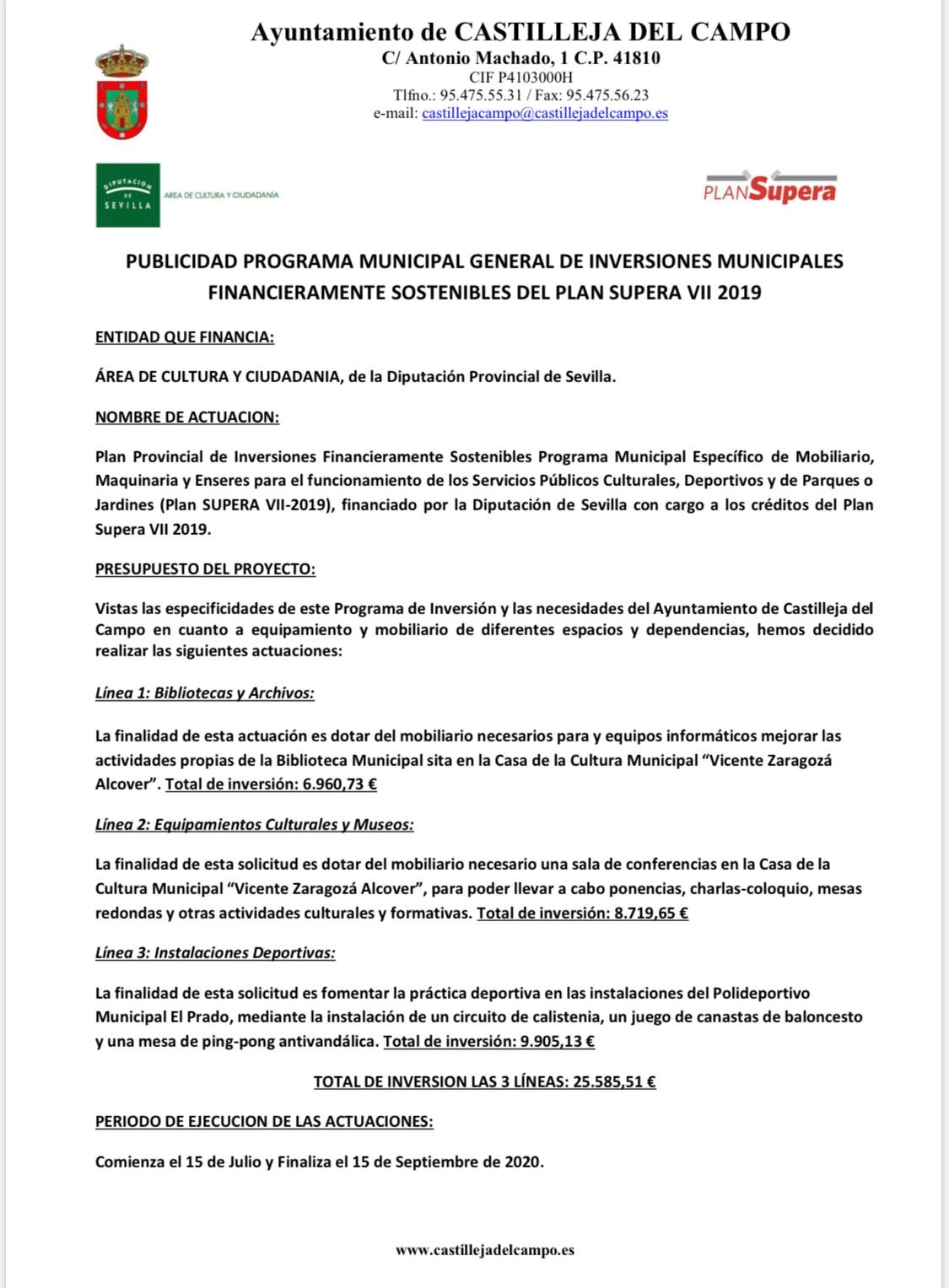 PUBLICIDAD PROGRAMA MUNICIPAL GENERAL DE INVERSIONES MUNICIPALES FINANCIERAMENTE SOSTENIBLES DEL PLAN SUPERA VII 2019
