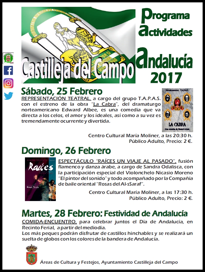 Programa de Actividades.Sábado, 25 de Febrero: Representación Teatral, a cargo del Grupo T.A.P.A.S. con el estreno de la obra ``La Cabra´´.